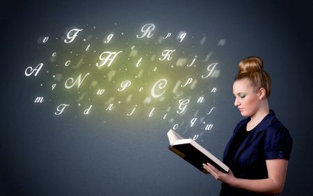 Casual young woman holding book with shiny letters flying out of it