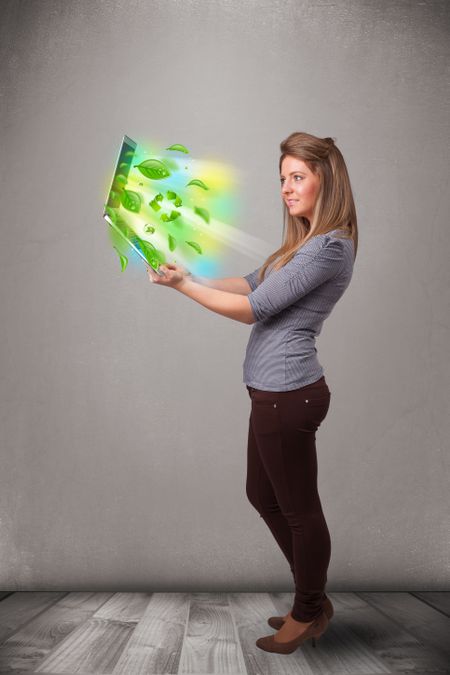 Casual young woman holding notebook with recycle and environmental symbols