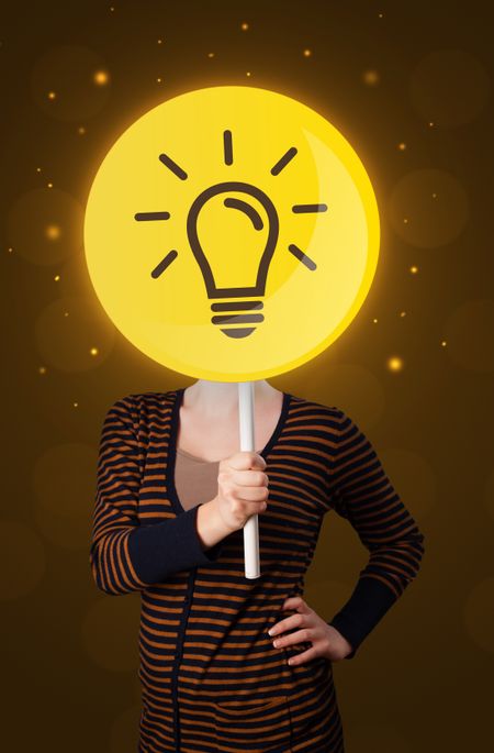 Casual young woman holding round sign with yellow lightbulb