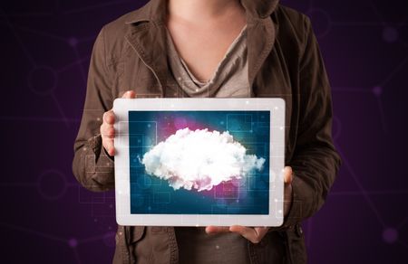 Casual young woman holding tablet with cloud concept and purple background