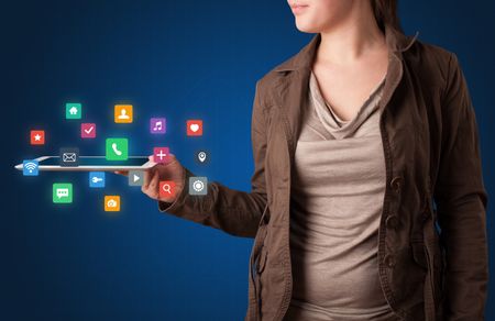 Casual young woman holding tablet with colorful applications