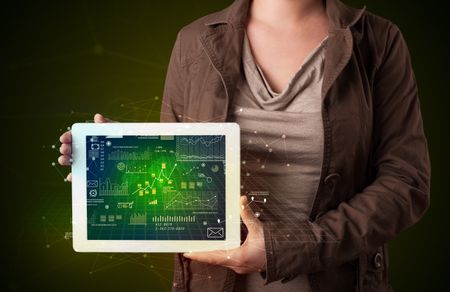 Casual young woman holding tablet with strategy and business related graphics