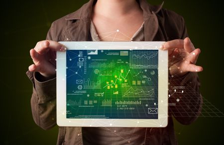 Casual young woman holding tablet with strategy and business related graphics