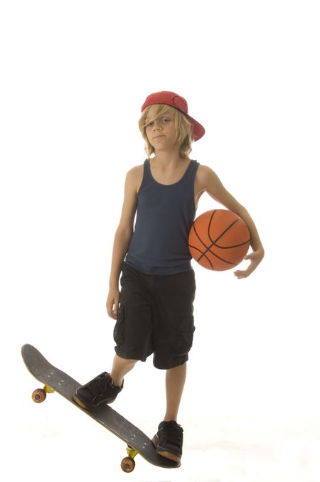 Caucasian boy of ten with long blond hair holds basketball and stands balanced on end of skateboard