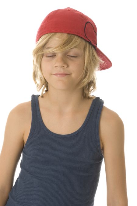 Caucasian boy of ten with long blond hair and red baseball cap has his eyes closed, making a wish perhaps, with a smile