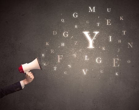 Caucasian business arm holding megaphone with letter cloud