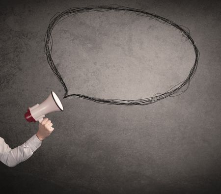 Caucasian business hand holding megaphone with drawn empty speech bubble