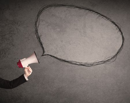 Caucasian business hand holding megaphone with drawn empty speech bubble