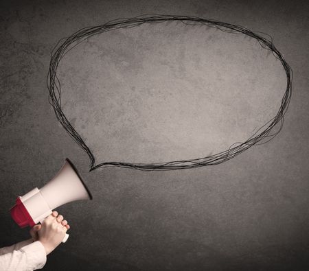Caucasian business hand holding megaphone with drawn empty speech bubble