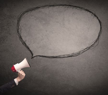 Caucasian business hand holding megaphone with drawn empty speech bubble