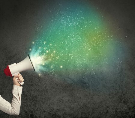 Caucasian business hand holding megaphone with white sparkles on a grunge background