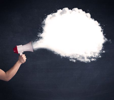 Caucasian business hand holding megaphone with white plain message cloud