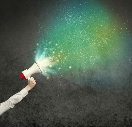 Caucasian business hand holding megaphone with white sparkles on a grunge background