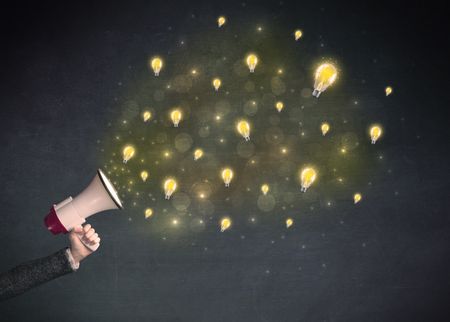 Caucasian business hand holding megaphone with yellow lightbulbs