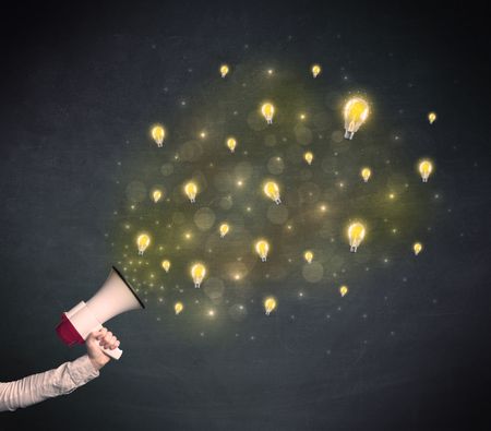 Caucasian business hand holding megaphone with yellow lightbulbs