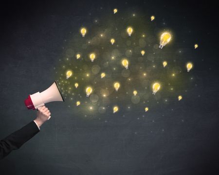 Caucasian business hand holding megaphone with yellow lightbulbs
