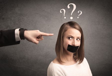 Caucasian business hand pointing at female employee with big white question mark above her head