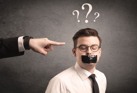 Caucasian business hand pointing at scared employee with big white question marks above his head