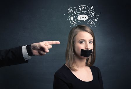 Caucasian business hand pointing at stressed female employee with drawn question, explamation marks above her head