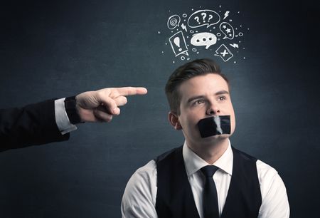 Caucasian business hand pointing at stressed male employee with drawn question, explamation marks, talk bubble above his head