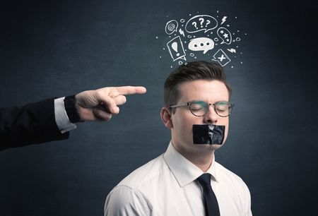 Caucasian business hand pointing at stressed male employee with drawn question, explamation marks, talk bubble above his head