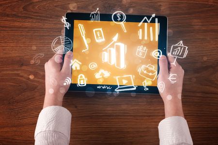 Caucasian business hands holding tablet with blue statistics and finances screen