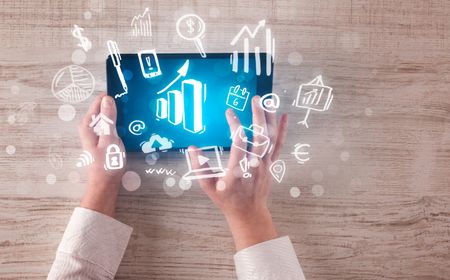 Caucasian business hands holding tablet with blue statistics and finances screen