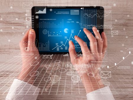 Caucasian business hands holding tablet with business screen