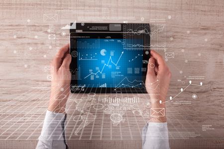 Caucasian business hands holding tablet with business screen