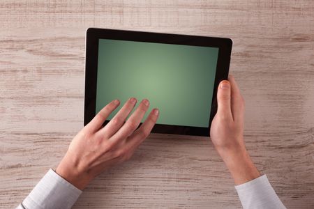 Caucasian business hands holding and working on plain tablet