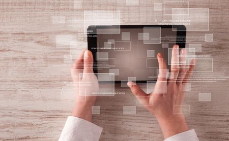 Caucasian business hands holding and working on tablet