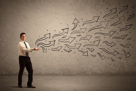 Caucasian businessman holding black drawn arrow symbols