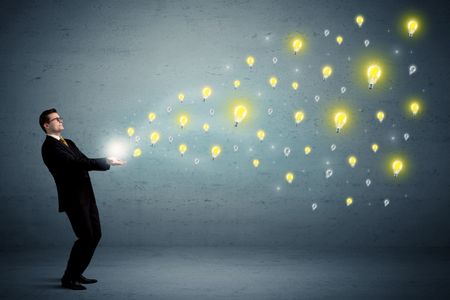 Caucasian businessman holding lightbulbs which are flying out from his hands