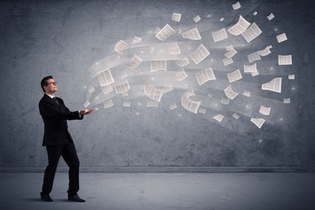 Caucasian businessman holding newspapers, which are floating away from his hands