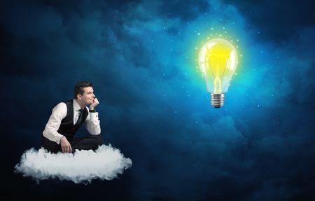 Caucasian businessman sitting on a white fluffy cloud lookind and wondering at a big, shiny, glowing yellow lightbulb