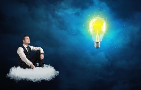 Caucasian businessman sitting on a white fluffy cloud lookind and wondering at a big, shiny, glowing yellow lightbulb