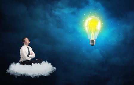 Caucasian businessman sitting on a white fluffy cloud lookind and wondering at a big, shiny, glowing yellow lightbulb