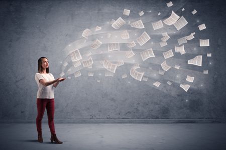 Caucasian businesswoman holding newspapers, which are floating away from his hands
