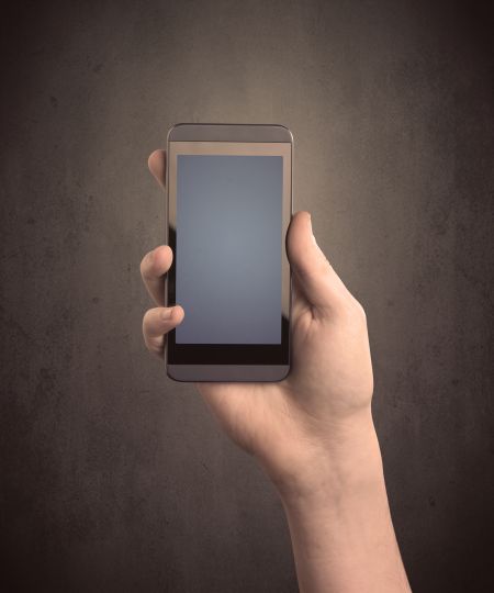 Caucasian hand in business suit holding a blank screen smartphone