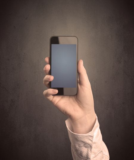 Caucasian hand in business suit holding a blank screen smartphone
