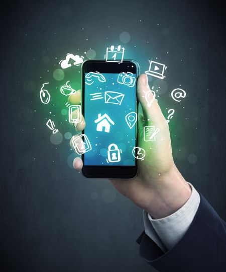 Caucasian hand in business suit holding a smartphone with drawn web icons