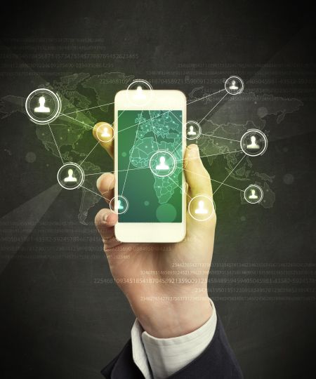 Caucasian hand in business suit holding a smartphone, social network concept