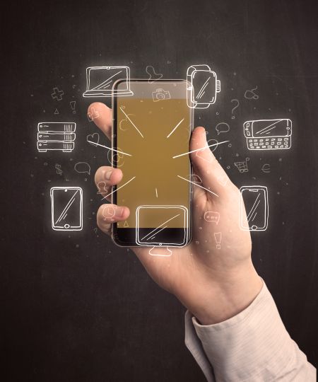 Caucasian hand in business suit holding a smartphone with hand-drawn icons