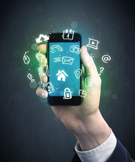 Caucasian hand in business suit holding a smartphone with drawn web icons