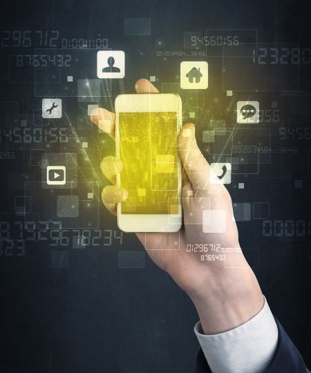 Caucasian hand in business suit holding a smartphone with golden-yellow holographic screen