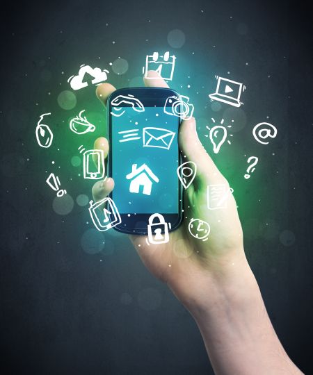 Caucasian hand in business suit holding a smartphone with drawn web icons