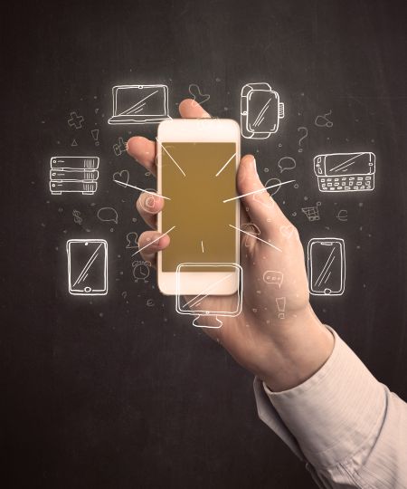 Caucasian hand in business suit holding a smartphone with hand-drawn icons