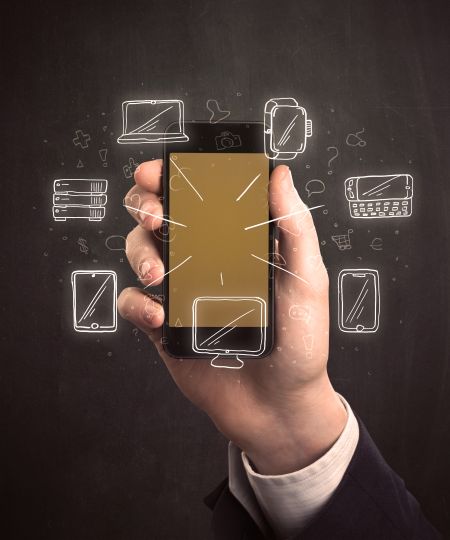 Caucasian hand in business suit holding a smartphone with hand-drawn icons