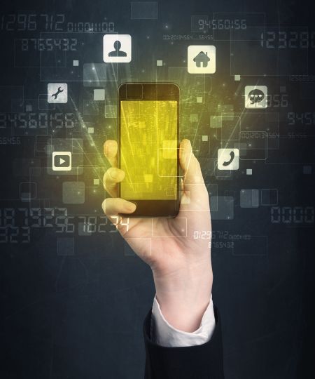Caucasian hand in business suit holding a smartphone with golden-yellow holographic screen