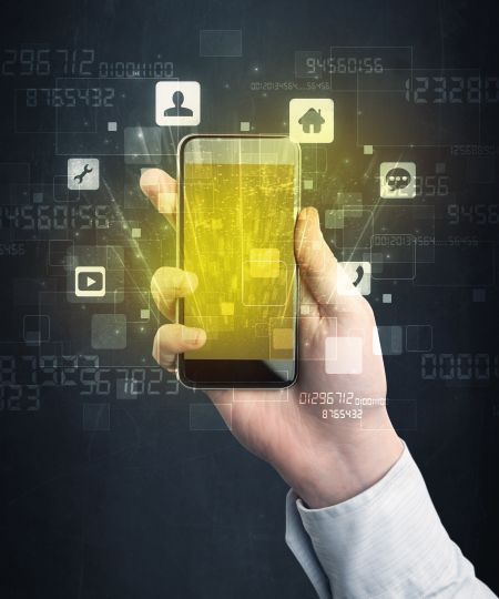 Caucasian hand in business suit holding a smartphone with golden-yellow holographic screen
